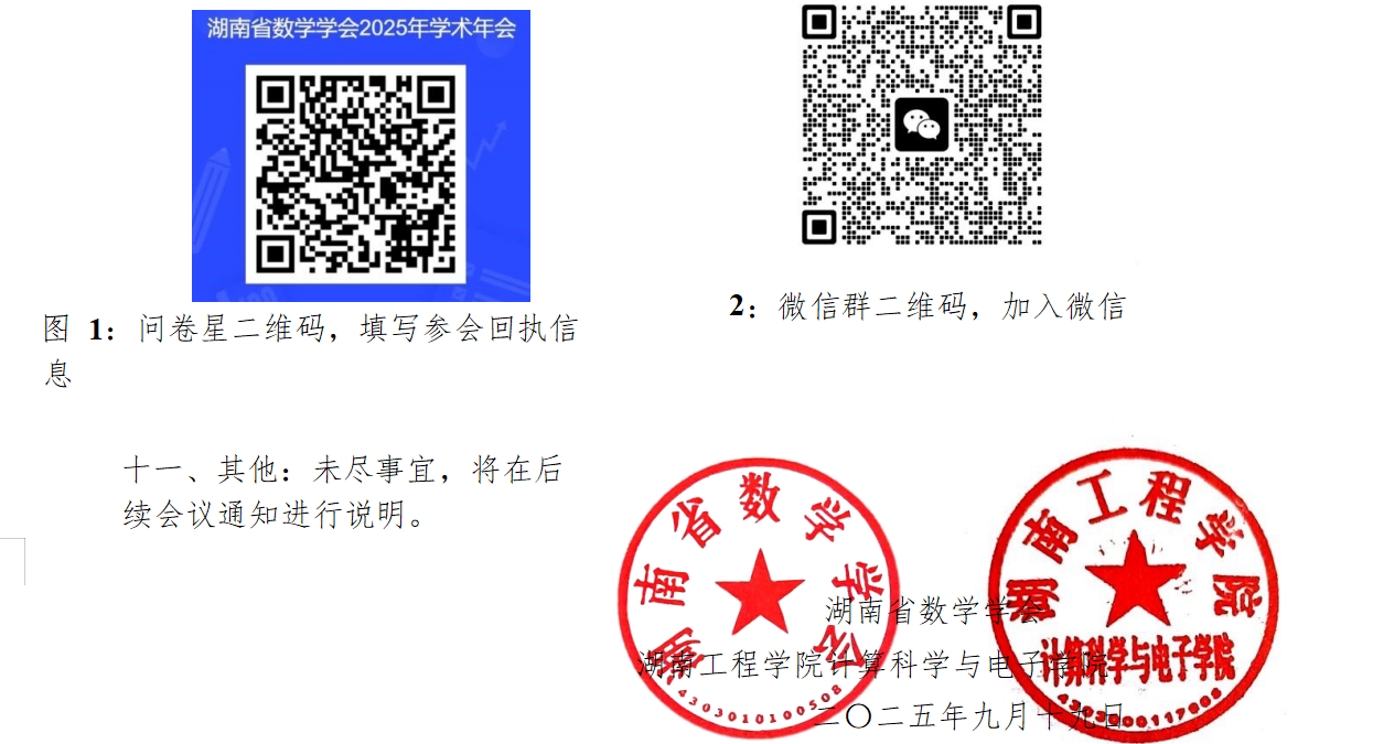 八、 会议报告:本次年会将邀请学术报告和教研报告。请各高校积极推荐报告(有数学博士点的高校至少推荐一个报告),请在2025年10月31日前将报告人姓名、单位、标题、摘要发到会务组邮箱:shuxueh@163.com,经湖南省数学学会讨论后,确定最终报告人选。